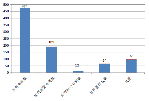 2021年度登记的科技成果中,获得知识产权总数836件。其中,发明专利数474件,占专利总数56.70%;实用新型专利数189件,占专利总数22.61%;外观设计专利数12件,占专利总数1.44%;软件著作权数64件,占7.66%;其他共有97件,占专利总数11.60%。因此,科技成果以发明专利为主,实用新型专利为辅。