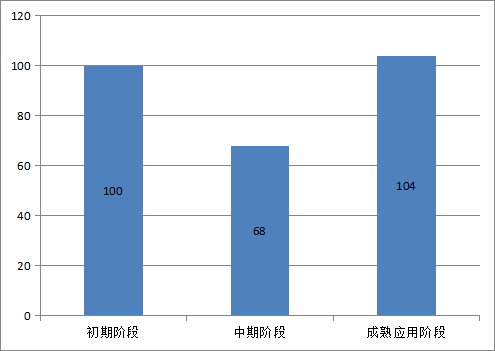 从应用情况分析,初期阶段为100项,占可统计数据的36.76%;中期间段为68项,占可统计数据的25.00%;成熟应用阶段为104项,占可统计数据的38.24%,因此,从成果所处阶段分析,成果在成熟应用阶段中占比最大。