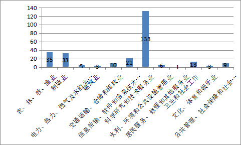从成果应用行业来看,农、林、牧、渔业行业成果35项,制造业行业成果33项,电力、热力、燃气及水的生产和供应业行业成果5项,建筑业行业成果3项,交通运输、仓储和邮政业行业成果10项,信息传输、软件和信息技术服务业行业成果21项,科学研究和技术服务业行业成果133项,水利、环境和公共设施管理业行业成果6项,居民服务、修理和其他服务业行业成果1项,卫生和社会工作行业成果13项,文化、体育和娱乐业成果3项,公共管理、社会保障和社会组织行业成果9项。