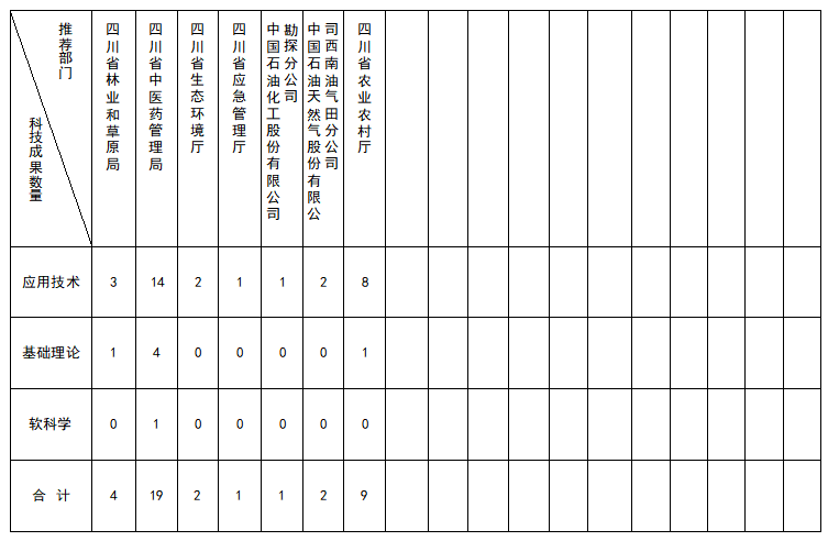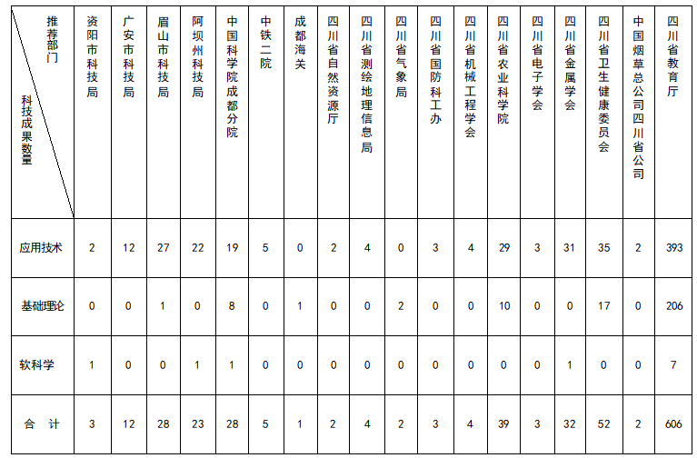 推荐部门 科技成果数量 | 四川省科学技术厅 | 成都市科技局 | 自贡市科技局 | 攀枝花市科技局 | 凉山州科技局 | 泸州市科技局 | 德阳市科技局 | 绵阳市科技局 | 广元市科技局 | 内江市科技局 | 遂宁市科技局 | 巴中市科技局 | 乐山市科技局 | 宜宾市科技局 | 南充市科技局 | 达州市科技局 | 雅安市科技局 | 甘孜州科技局 |