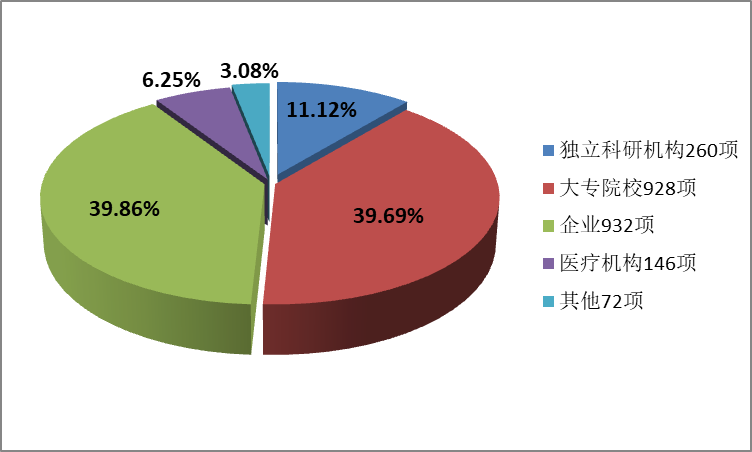 2021年登记的科技成果第一完成单位按属性归为五大类,各类项数、所占比例为:独立科研机构260项,占本年度成果第一完成单位的11.12 %;大专院校928项,占本年度成果第一完成单位的39.69 %;企业 932项,占本年度成果第一完成单位的39.86 %;医疗机构146项,占本年度成果第一完成单位的6.25 %;其他72项,占本年度成果第一完成单位的3.08 % 。