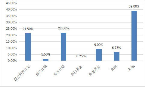 2021年度登记的科技成果仍以各级财政支持的各类计划项目成果为主,来源于各级科技计划项目的成果180项,占成果登记总数的45.00%;部门基金1项,占0.25%;地方基金36项,占9.00%;自选项目27项,占6.75%;其他项目156项,占39.00%。各级计划项目中,国家科技计划项目86项,占成果登记总数的21.50%;地方计划88项,占22.00%;部门计划6项,占1.50%。国家科技计划项目成果中,自然科学基金项目79项,占成果登记总数的19.75%,基地和人才专项2项,占0.50%。见图1: