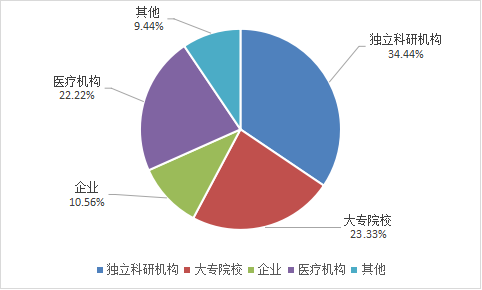 据统计,各级科技计划项目成果完成单位分布主要集中在独立科研机构、大专院校、医疗机构、企业,其中,独立科研机构完成的成果62项,占各级科技计划成果总数的34.44%;大专院校完成的成果42项,占23.33%;医疗机构完成的成果40项,占22.22%;企业完成的成果19项,占成果登记总数的10.56%;其他单位完成成果17项,占9.44%。见图2: