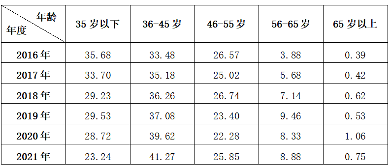 表1:2016-2021年科技成果完成人员年龄结构(%)