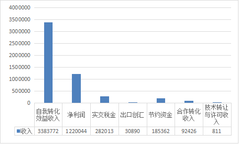 (1)2021年登记的科技成果自我转化效益合计收入338.38亿元,其中,净利润122.00亿元,占自我转化总收入的36.06%;实交税金28.20亿元,占8.33%;出口创汇3.09亿元,占0.91%;节约资金18.54亿元,占5.48%。合作转化收入9.24亿元,技术转让与许可收入收入811.00万元。如图7: