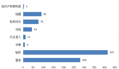 2021年度江苏科技成果评价方式发生了改变,验收第一次超过了鉴定,综合考虑应该是受国家科技成果评价相关改革政策影响。2021年江苏省所有科技成果登记中验收项目415项,占总量的45%;鉴定项目280项,占总量的30%;其他评价方式中评审项目9项;行业准入项目为12项;评估项目为44项;机构评价项目为76项;结题项目90项,知识产权授权数4项。
