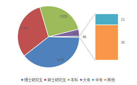 2021年江苏科技成果完成人的文化程度博士研究生人数持续保持第一,标志着我省科技人才层次不断攀升,硕士研究生学历以上的完成人占总完成人数的70%:博士研究生3102人次,硕士研究生2463人次,大学本科2025人次,大学本科学历以上完成人均有增长,大学本科学历以下完成人均下降,其中大专310人次,中专22人次,其他36人次。