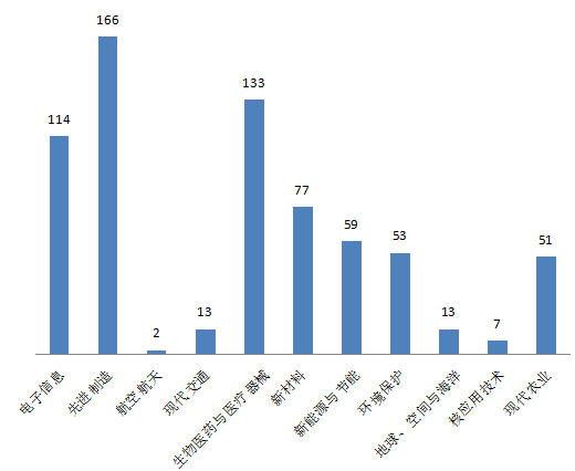 2021年江苏应用技术成果所属高新技术领域分布,电子信息114项,先进制造166项,航空航天2项,现代交通13项,生物医药与医疗器械133项,新材料77项,新能源与节能59项,环境保护53项,地球、空间与海洋13项,核应用技术7项,现代农业51项。