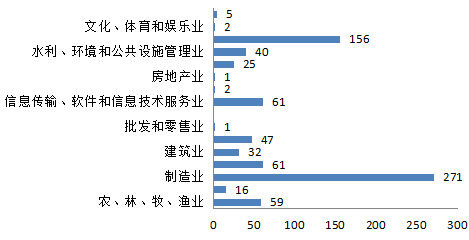 2021年江苏科技成果应用行业涉及16个方面,农、林、牧、渔业59项,采矿业16项,制造业271项,电力、热力、燃气及水的生产和供应业61项,建筑业32项,批发与零售业1项,信息传输、软件和信息技术服务业61项,金融业2项,房地产业1项,科学研究和技术服务业25项,水利、环境和公共设施管理业40项,卫生和社会工作156项,文化、体育和娱乐业2项,公共管理、社会保障和社会组织5项。