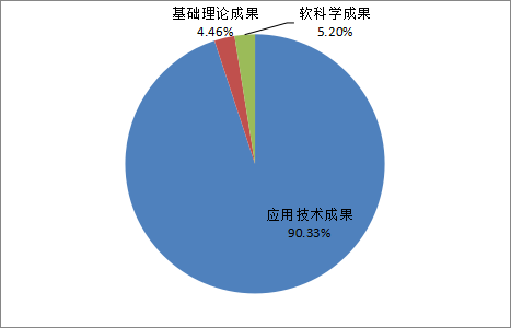 269项科技成果中,应用技术成果243项,占全年总数90.33%;基础理论成果12项,占全年总数4.46%。软科学成果14项,占全年总数5.20%;因此,应用技术成果是科技成果的主要类别。
