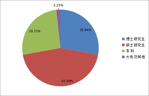 在完成项目人员文化程度方面,博士研究生771人次,占全部人员25.94%;硕士研究生1358人次,占全部人员45.69%;本科生779人次,占全部人员26.21%;大专生及以下64人次,占全部人员的2.25%。从学历比例上看,独立科研机构博士、硕士和本科人员是科研的中坚力量。