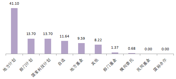 以各级财政支持的计划项目成果为主。其中,来源于各级科技计划项目的成果100项,占68.49%;部门基金和地方基金项目成果16项,占10.96%。在各级科技计划项目中,国家科技计划项目成果占登记总量的13.70%;部门科技计划项目成果占13.70%;地方科技计划项目成果占41.10%。在国家科技计划项目成果中,国家自然科学基金项目13项,占登记总量的8.90%;国家重点研发计划项目1项,占登记总量的0.68%;基地和人才专项项目1项,占登记总量的0.68%;其他国家科技计划项目5项,占登记总量的3.42%(见图2)。
