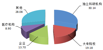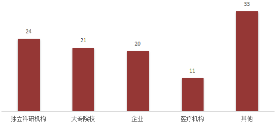独立科研院所是项目成果的主要完成单位,按成果数量排序依次是:独立科研机构44项,占30.14%;其他项目41项,占28.08%;大专院校28项,占19.18%;企业20项,占13.70%;医疗机构13项,占8.90%(见图3)。