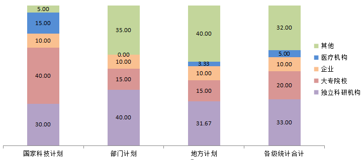 在100项各级科技计划项目成果中,独立科研机构和其他机构是主要完成单位。其中,独立科研院所所占比例最高,为33.00%;其次是其他机构占32.00%(见图4)。