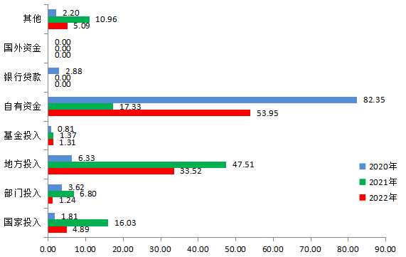 2022年累计投入27184万元,其中,国家投入1330万元,占4.89%;部门投入338万元,占1.24%;地方投入9113万元,占33.52%;基金投入355万元,占1.31%;自有资金投入14664万元,占53.95%;其他资金投入1384万元,占5.09%(见图5)。