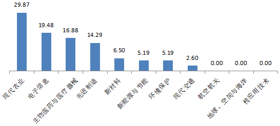 77项应用技术成果属于高新技术领域,主要集中在现代农业,其次是电子信息、生物医药与医疗器械领域和先进制造,新材料、新能源与节能和环境保护等领域项目成果也占一定比例(见图6)。