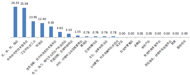应用技术成果主要应用于农、林、牧、渔业与科学研究和技术服务业,分别占26.35%和25.58%;卫生和社会工作行业与制造业等应用成果也占一定比例,分别占13.95%和12.40%(见图7)。