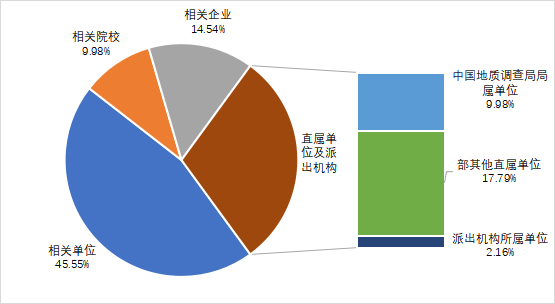 有249项成果由部直属单位及派出机构登记,占登记总量的29.93%,其中,有83项成果由中国地质调查局局属单位登记,占登记总量的9.98%,有148项成果由部其他直属单位登记,占登记总量的17.79%,有18项成果由派出机构所属单位登记,占登记总量的2.16%。