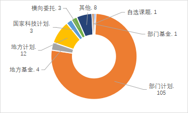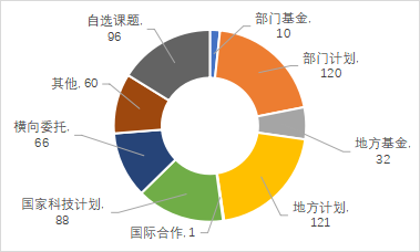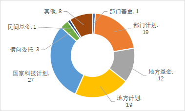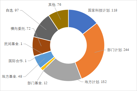 科技成果以财政支持的课题来源为主。来自国家科技计划,部门计划,地方计划及部门基金和地方基金等财政支持的科技成果574项,占登记成果总量的69.91%。其中,部门计划、地方计划和国家科技计划登记科技成果数量远高于其他课题来源,分别占登记科技成果总量的29.72%、18.51%和14.37%。