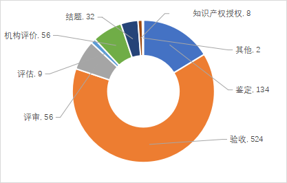 2022年度登记的非涉密成果中,验收项目524项,占比63.82%;鉴定项目134项,占比16.32%;评审项目56项,占比6.82%;机构评价56项,占比6.82%;结题项目32项,占比3.90%;评估项目9项,占比1.10%;知识产权授权8项,占比0.97%;未登记行业准入。