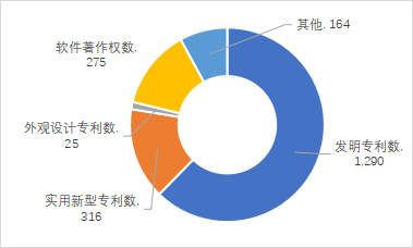 2022年度登记的科技成果共产出知识产权2070项,其中,已授权专利数1227项。从知识产权类型看,发明专利为主要类型,占知识产权总量的62.32%;其次为实用新型专利和软件著作权,分别占知识产权总量的15.27%和13.29%。