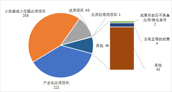 应用技术成果中,小批量或小范围应用的科技成果所占比例最高,为43.43%,产业化应用的科技成果占比37.21%,试用的科技成果占比10.94%,未应用、应用后停用的科技成果所占比例不高,分别为8.25%和0.17%。