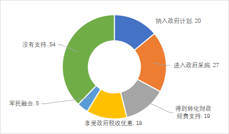 从应用技术成果获得政府支持的情况统计,共有143项成果反馈有效数据。其中,有89项成果获得了政府支持,支持形式主要为进入政府采购,占比为18.88%;其次为纳入政府计划和得到转化财政经费支持,占比分别为13.99%和13.29%;享受政府优惠的项目占比为12.59%。37.76%的应用技术成果反馈在转化阶段没有得到政府支持。