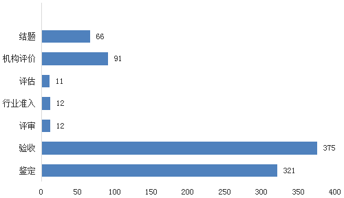 2022年江苏省所有科技成果登记中验收项目375项,占总量的42%;鉴定项目321项,占总量的36%;其他评价方式中评审项目12项;行业准入项目为12项;评估项目为11项;机构评价项目为91项;结题项目66项。