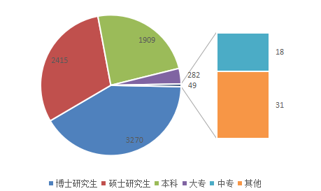 2022年江苏科技成果完成人的文化程度博士研究生人数持续保持第一,标志着我省科技人才层次不断攀升,硕士研究生学历以上的完成人占总完成人数的71%:博士研究生3270人次,硕士研究生2415人次,大学本科1909人次,大学本科学历以上完成人均有增长,大学本科学历以下完成人均下降,其中大专282人次,中专18人次,其他31人次。