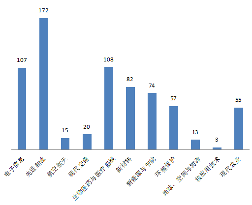 2022年江苏应用技术成果所属高新技术领域分布,电子信息107项,先进制造172项,航空航天15项,现代交通20项,生物医药与医疗器械108项,新材料82项,新能源与节能74项,环境保护57项,地球、空间与海洋13项,核应用技术3项,现代农业55项。