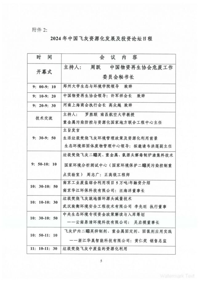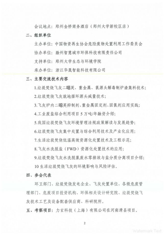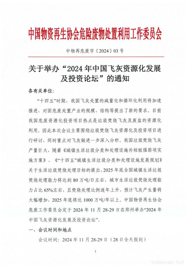 中国物资再生协会危废工作委员会定于2024年11月28-29日在郑州举办“2024年中国飞灰资源化发展及投资论坛”。